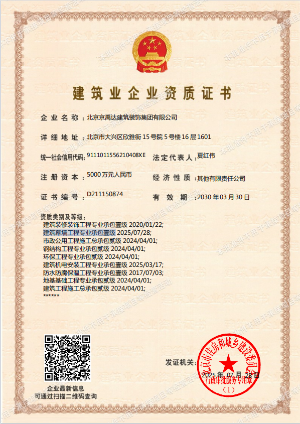 在建筑行业蓬勃发展的浪潮中,京禹达集团凭借卓越的实力与不懈的努力,实现了又一重大突破——建筑幕墙资质荣升壹级!这不仅是对集团过往成绩的高度肯定,更是迈向未来的坚实新起点。至此,京禹达集团成功构建“四个壹”,即建筑装修装饰工程专业承包壹级、建筑幕墙工程专业承包壹级、建筑机电安装工程专业承包壹级以及防水......