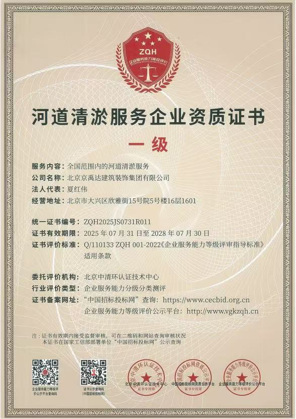 京禹达集团荣获 “河道清淤服务企业资质 ”一级,实力再获认可!