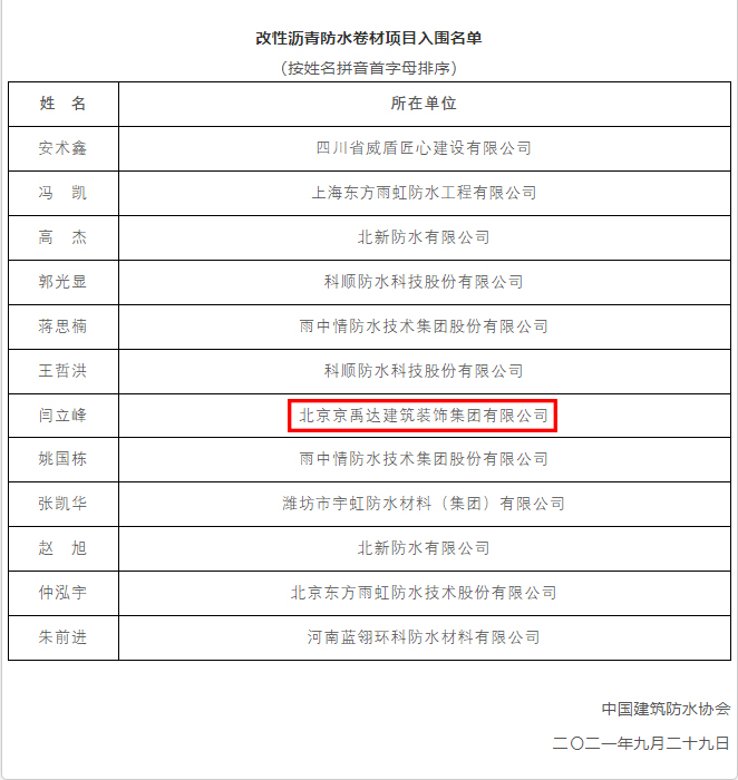 2021年9月26-29日,2021年全国建筑防水行业(防水工)职业技能大赛复赛在北京顺利举行,京禹达集团以优异得成绩进入决赛。