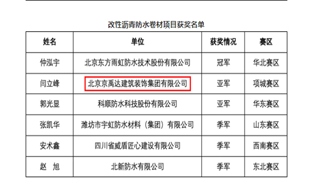 11月6日,2021年全国建筑防水行业职业技能大赛决赛圆满落幕。作为出赛的京禹达集团,表现出色,荣获2021年防水行业职业技能大赛改性沥青防水卷材项目组亚军的优异成绩。