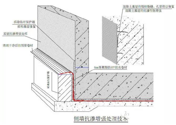 采用水泥基渗透结晶型防水涂料+改性沥青防水涂料+卷材的复合防水做法。: