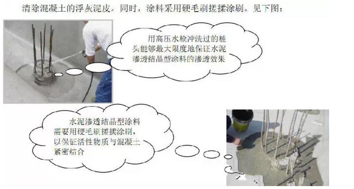 1.桩头防水处理的关键是桩头的清理工序,采用高压水枪冲洗桩顶面混凝土能够有效清除混凝土的浮灰泥皮。同时,涂料采用硬毛刷搓揉涂刷。见下图: