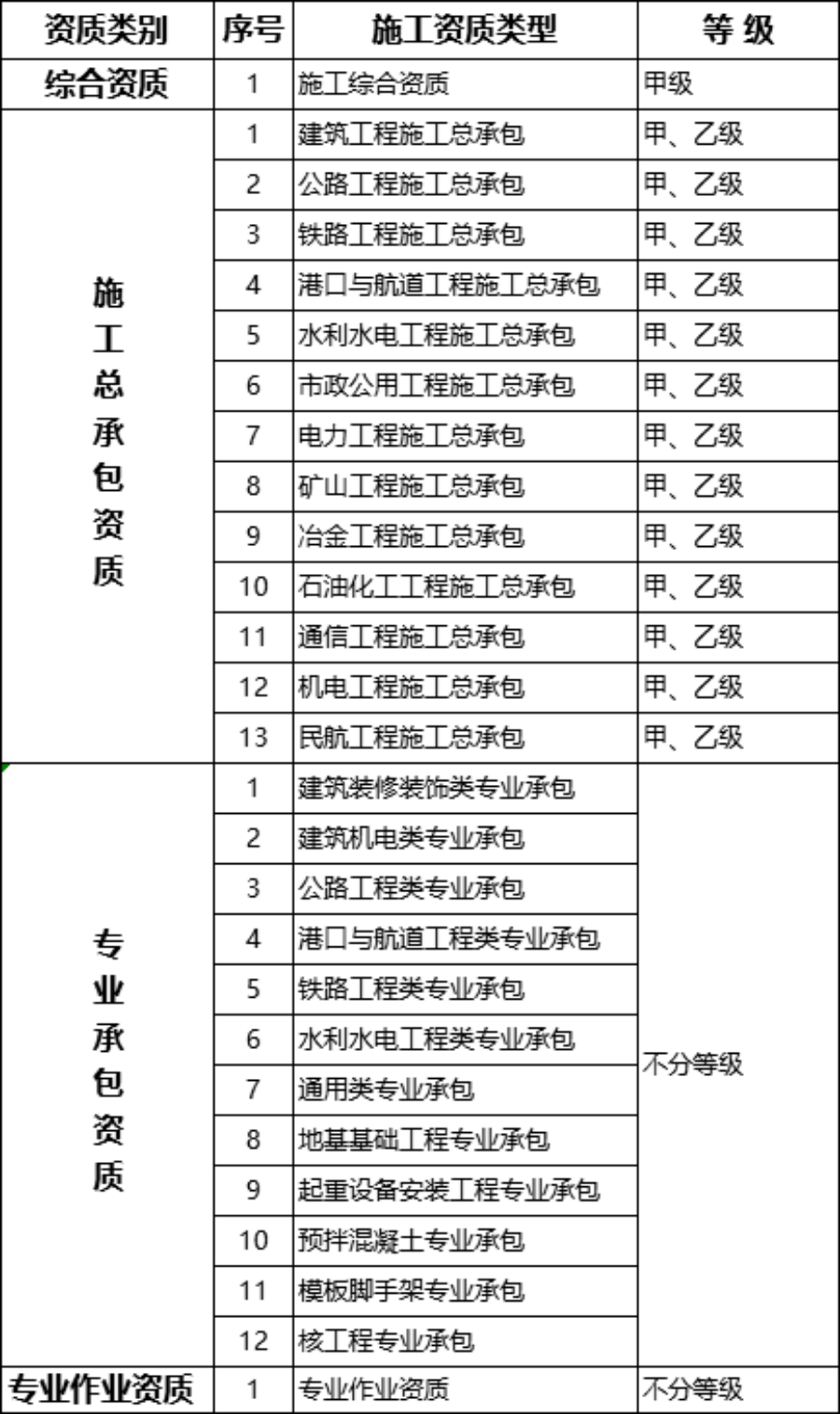 保留原12类施工总承包资质。施工总承包资质等级压减为甲、乙两级,甲级资质在本类别内承揽业务规模不受限制,原一级资质调整为甲级资质,其他等级资质合并为乙级资质。